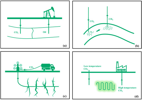 Undoubtedly, the amount of sequestration that can be achieved by geological storage of CO2 is enormous compared to fixed products, such as building materials, food, beverage, etc. Estimations have shown that China’s geological storage potential of CO2 is roughly 1.21 × 1012~4.13 × 1012 t []. Obviously, CO2 can be widely used in underground energy development and storage. Among them, using carbon dioxide to flood oil or gas is one of the methods of CO2 utilization (Figure 1a,b), which has been practiced worldwide in the oil and gas industry []. Injection of CO2 into hydrocarbon formations is able to provide significant underground storage for CO2 while enhancing hydrocarbon recovery (CO2-EOR, CO2-EGR) which cuts down the expenses. Moreover, as emerging technologies with significant potential and application interest, CO2 fracturing and CO2 application in geothermal energy development have also attracted increasing attention from both academics and industries (Figure 1c,d). Generally, considering a portion of carbon dioxide is sequestrated permanently below the surface in geological utilization, CCUS technologies can accomplish negative carbon emissions.