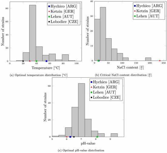 To realize the ideal biomethanation of injected H2 and CO2 underground, two conditions need to be met: (i) the injected gas will not leak underground; (ii) the methanogens have high biological activity. As for the first aspect, trapping (e.g., anticline and fault) and impermeable cap rock are necessary to prevent the migration and leakage of the injected gas. As a large amount of oil and gas was stored in depleted reservoirs before production, the sealing performance of depleted reservoirs is more reliable than that of aquifers. In terms of the methanogens’ activity, it is affected by temperature, porosity, water saturation, pH, salinity, and so on (Figure 3): (1) Methanogen growth also requires pore space and water. Strobel et al. [] suggested that the minimum reservoir porosity and permeability for biomethanation are 10% and 10mD, respectively, and pores should be connected for easier injection. Moreover, the minimum water saturation is 10%; (2) Higher and lower temperatures affect the activity of enzymes in methanogens, and even lead to the death of methanogens. Most methanogens can survive in the temperature range of 15 to 90 °C, and the favorable temperature range of 30 to 70 °C []; (3) The brine pH affects the methanogen’s growth by directly affecting metabolism or indirectly through redox reactions. Most methanogens will die if the pH range is outside the range of 4 to 9.5, and the favorable pH range is 6.5 to 7.5; (4) The salinity affects the osmotic pressure of methanogen cells, and higher salinity causes methanogen cells to lose too much water and die. The upper limit of salt content for the growth of methanogen is 150 g/L. The environmental requirements for underground biomethanantion are summarized in Table 1.