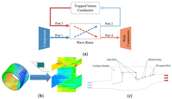 Model of wave rotor–trapped vortex combustor system. (a) Principle of system; (b) unfolded structure of wave rotor; (c) structure of TVC.