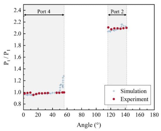 Comparing the average pressure ratio of the simulation and the experiment, a relative error for average pressure at Port 2 is 0.189% and that at Port 4 is 0.672%. A good agreement on simulation and experiment could be found obviously. The agreement proves the reliability of the simulation on the system in this research. In addition, the mesh has been verified to be grid-independent and time step-independent [19].