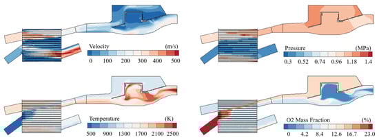 With the development of combustion processes, there is not enough fuel or oxygen to maintain combustion. The air mass turns into the gas mass, and the gas mass is divorced from the cavity under the drive of the main stream, which is represented as the flame divorcing in Figure 5. The oxygen proportion is lowest and the temperature is highest in this stage.