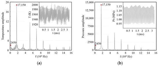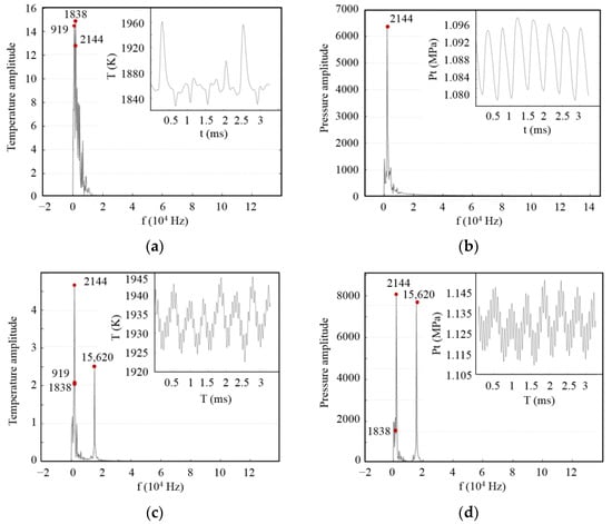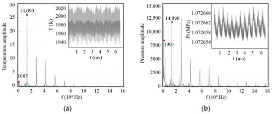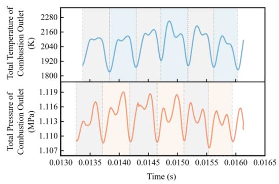 Despite the parameter variation delay at the combustor outlet as a result of the distance between the combustion center and the combustor outlet, the time of a full combustion period will never change. From the variation of pressure and temperature over time at the combustor outlet in Figure 6, a nearly same period of pressure and temperature is found with the variation lag of temperature behind pressure by about 7.65 × 10−5 s. The identity is caused by the coupling of pressure and temperature in flow field, and the lag is triggered by the different transmitting of pressure and temperature. The average temperature period of ten adjacent fluctuation is (4.53 ± 0.3) × 10−4 s, which indicates the combustion period.