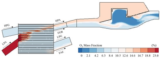 Although a good index, the mass fraction of EGR is hard to measure directly. Oxygen, as shown in Figure 8, is capable of reflecting the mixing of air and gas as the tracer material. In channels, there is the mass transfer and the energy conversion between LPA of low temperature, low pressure, and high oxygen mass fraction from Port 1 and HPG of high temperature, high pressure, and low oxygen mass fraction. The fluid properties at Port 2, especially the oxygen mass fraction and temperature, are close to those of the gas (LPA or HPG) whose mass fraction is more in mixed gas. When the energy conversion is taken into account only, it can be assumed that the entire HPA comes from part of the LPA and entire EGR comes from part of the HPG. Under the assumption, their mass fractions can be calculated by the oxygen mass fraction.