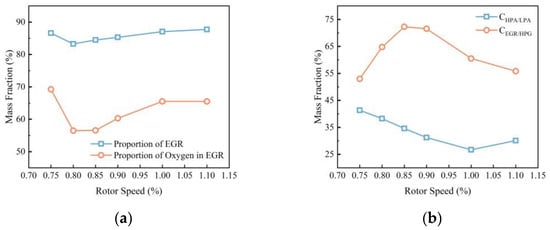 Influence of the rotor speed on the mixing process at Port 2. (a) EGR mass fraction; (b) HPA and EGR relative to LPA and HPG.