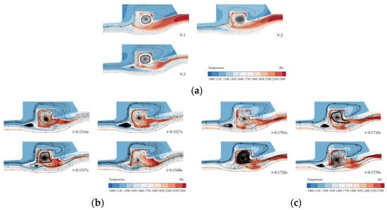 Streamline and the temperature distribution in the combustor of cases. (a) V-1, 2, and 3; (b) V-4; (c) V-5.