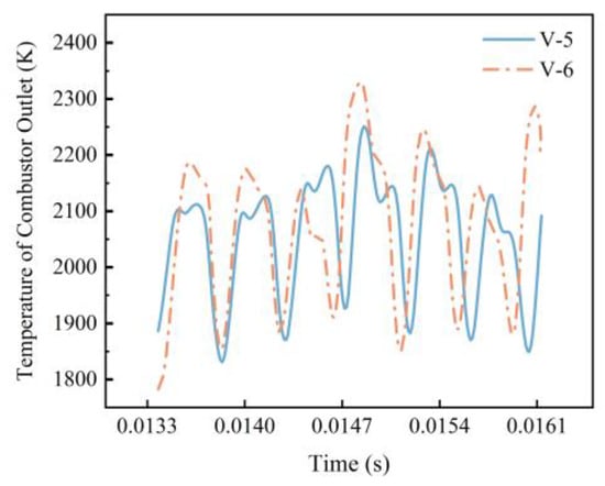 Variation of temperature at the combustor outlet in case V-5 and V-6.