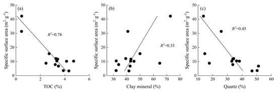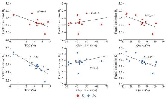 - Although clay minerals in continental shale can form a large number of micropores, they are filled with organic matter under low maturity conditions and the impact of compaction weakens the impact on pore structure and fractal characteristics of shale. Rigid minerals such as quartz can support and protect pores, provide space for organic matter filling and are not easy to dissolve under low mature conditions, reducing the heterogeneity of pore structure of low mature continental shale.