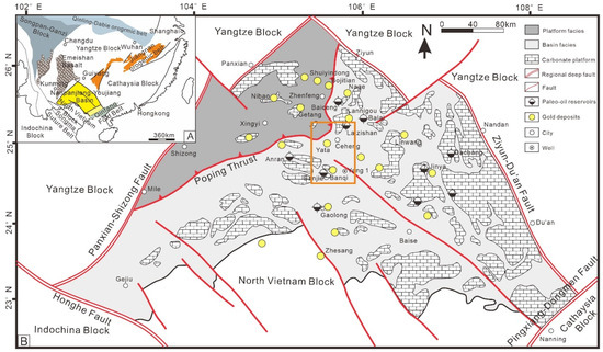 (A) Tectonic location map of the Nanpanjiang-Youjiang Basin [18]). (B) Simplified geological and structural map of the Nanpanjiang Basin, showing locations of both hydrocarbon reservoir and gold deposits [17].
