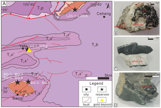 Paleo-reservoirs and Carlin-type gold deposits are widely developed in the Nanpanjiang-Youjiang Basin, Yangtze Block [2]. Hydrocarbons are widely enriched in Devonian and Permian limestone [14], Carlin-type gold deposits are abundant in Permian-Triassic carbonate rocks and terrigenous clastic rocks, and the proven Au resources exceed 1000 t [15,16]. There is a close spatial correlation between paleo-reservoirs and the gold deposits in the basin [17]. The Yata gold deposit and Yata paleo-reservoir, the Lannigou gold deposit, and the Laizishan paleo-reservoir overlap [2]. Solid bitumen can be observed within the gold-bearing strata [13]. As an important gangue mineral, the calcite in the Nanpanjiang-Youjiang Basin is closely associated with bitumen, gold-bearing pyrite, and other ore minerals, which is key to understanding the hydrocarbon accumulation and Carlin-type gold mineralization. Here we focus on the Laizishan, Yata, and Banqi districts that include paleo-reservoirs and gold deposits as the research area (Figure 1). Integrating petrographic, cathode luminescence, and fluid inclusion analysis on the calcite in this work and some chronological data (calcite U-Pb date, bitumen Re-Os date) related to petroleum evolution and mineralization from published works, this study aims at establishing the relationship between fluid evolution and hydrocarbon accumulation and Carlin-type gold mineralization in the Nanpanjiang-Youjiang Basin against the geological background.