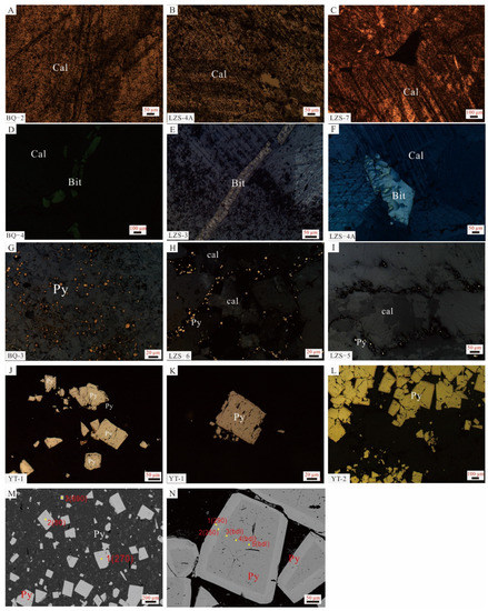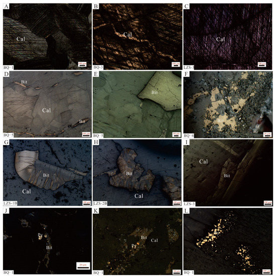 Black/gray calcite is mostly granular, with particle sizes ranging from tens to hundreds of micronmeters. Under the microscope, two groups of clear cleavage lines with good continuity and straight lines could be found (Figure 4A–C). In addition, a large number of cracks and intragranular/intercrystalline dissolved pores filled with bitumen had developed in the calcite. The occurrence of bitumen is strictly controlled by the pore morphology, and banded (Figure 4D), lumpy, and disseminated (Figure 4F) shapes were discovered. For example, bitumen directionally fills in the cracks at the edge of the calcite veins in sample BQ-5 (Figure 4D). According to the optical characteristics, two types of bitumen could be identified. The first type was mainly found in the black/gray calcite from the Banqi area. They were homogeneous and showed yellow under reflected light (Figure 4D–F). The other type of bitumen was mainly found in gray calcite samples from the Laizishan area. Compared with the first type, they were colored dark grey and possessed strong anisotropy. They featured a flat boundary, wavy extinction, and flowing structure (Figure 4G–I). In addition to bitumen, a small amount of fine-grained pyrite with a particle size <30 μm was developed in the black calcite sample BQ-1 (Figure 4L). Similar to previous studies [13], the pyrite and bitumen grains were closely associated, and some pyrite was wrapped by bitumen (Figure 4J,K).