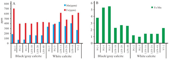 The cathode luminescence of carbonate minerals is affected by many factors, such as Fe, Mn content, total rare earth element content, and crystal structure [33,34]. Respectively acting as activators and quenchers, Mn and Fe can activate and reduce cathode luminescence. Thus, the content and ratio of the Fe and Mn of the calcite have an important impact on the characteristics of cathode luminescence [33]. Under the conditions of Mn > 40 μg/g and Fe < 5 × 103 μg/g, the cathode luminescence of the carbonate is controlled by the ratio of the contents of Fe and Mn. With a decrease in the Fe/Mn ratio, the cathode luminescence intensity increases [33,35]. The Fe and Mn contents and Fe/Mn ratio of calcite samples in the Banqi, Yata, and Laizishan areas are shown in Table 2. The Fe content of black/gray calcite and white calcite is nearly in the same range (396–704 ppm vs. 395–619 ppm) (Table 2, Figure 6A). However, the Mn content of white calcite is significantly higher (273–409 ppm) and leads to a lower Fe/Mn ratio (1.0–2.3) than that of black/gray calcite (2.3–5.5) (Figure 6A,B). The cathode luminescence of black/gray calcite and white calcite are respectively dark red (Figure 7A,B) and bright red (Figure 7C,D).