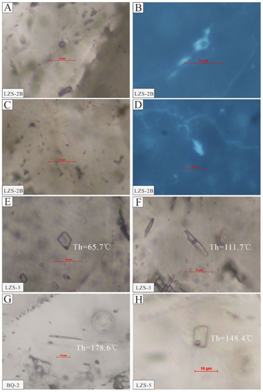 Typical characteristics of fluid inclusions in calcite in the Banqi-Yata-Laizishan area, Nanpanjiang-Youjiang Basin. (A–D) Irregular hydrocarbon inclusions, blue–white under fluorescence. (E) aqueous fluid inclusions, negative crystal, Th = 65.7 °C. (F) short columnar-shaped aqueous fluid inclusions, Th = 111.7 °C. (G) needle-like shape aqueous fluid inclusions, Th = 178.6 °C. (H) rectangle-shaped aqueous fluid inclusions, Th = 148.4 °C.