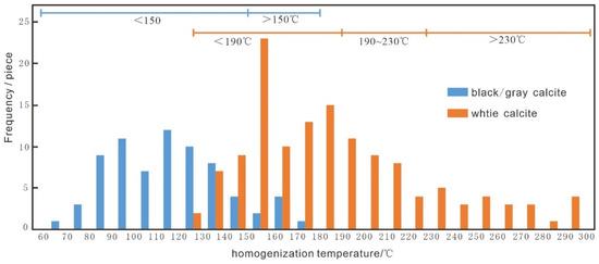 Three dark color and white color calcites possessing abundant fluid inclusions were selected for the Fluid inclusion analysis (Table 3). Hydrocarbon inclusions (from 5 to 10 μm) were found in black/gray calcite and showed a blue–white color under fluorescence (Figure 8A–D). The aqueous fluid inclusions (from 5 to 10 μm) associated with hydrocarbon inclusions were typical gas-liquid two-phase fluids and featured elliptic, needle-like, or short column shapes (Figure 8E). The homogenization temperature and salinity results are shown in Table 3. The homogenization temperature of aqueous fluid inclusions in black/gray calcite varied from 65.7 °C to 173.1 °C. Based on the frequency homogenization temperature, two groups, <150 °C (65.7–146.2 °C, mean ~110 °C) and >150 °C (155.4–173.1 °C, mean ~160 °C), were divided (Figure 9). According to the ice melting temperature (Tice), the calculated salinity of the fluid inclusion obtained using the formula [36] (Salinity = 1.78 Tice − 0.0442 Tice2 + 0.000557 Tice3) varied from 7.45 to 22.27 wt.% NaCl eq (average 17.01 wt.% NaCl eq) (Table 3). No hydrocarbon inclusions were found in white calcite. However, two-phase gas-liquid aqueous fluid inclusions were widely developed. The diameter of fluid inclusions was about 10 μm to 15 μm long and had oval, needle-like, and rectangular shapes (Figure 8G,H). The homogenization temperature (Th) of the inclusions varied from 128.2 °C to 299.9 °C. Three groups, >230 °C, 190–230 °C (mean ~205 °C), and <190 °C (mean ~160 °C), were divided according to the homogenization temperature frequency, and more than half (~57.8%) of the homogenization temperatures were lower than 190 °C (Figure 9). The measured salinity of fluid inclusions ranged from 0.88 to 13.51% (average 5.29 wt.% NaCl eq) (Table 3).