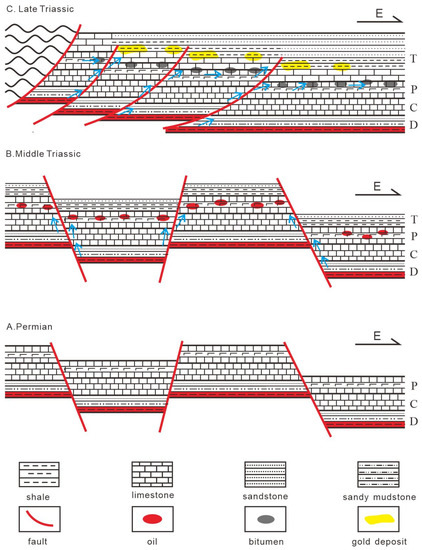 Integrating the basin fluid evolution and context of regional tectonic history, the genetic relationship between petroleum evolution and the Late Triassic Carlin-type gold mineralization in the Nanpanjiang-Youjiang Basin could be generally established. From the Late Carboniferous to the Permian, Devonian source rock was continuously buried and went into the oil window (Figure 12A). After this, the Indosinian tectonic event triggered the hydrocarbon migration, and Au was enriched from sedimentary rocks during the process (Figure 12B). In the Late Triassic, the rapid burial of the Permian reservoir caused the reservoir temperature to exceed 200 °C, which led to the crude oil being cracked into gas and pyrobitumen (Figure 12C). The oil cracking released the Au into the basin fluid and led to the gas-dominated TSR process. Finally, when Au and H2S-rich ore-forming fluid migrated into the Fe-rich calcareous and dolomitic siltstone formation, the gold-bearing pyrite was precipitated (Figure 12C).