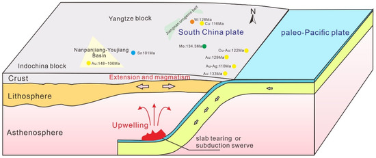 During the Early Cretaceous (~135 Ma), the subduction between the Paleo-Pacific and Eurasian plates (the Yanshanian tectonic event) formed an extensional environment resulting in lithospheric thinning and magmatic activity in the South China Block [65,66]. Corresponding to this tectonic event, a diversity of ore deposits such as low-temperature hydrothermal Cu-Ag deposits [67,68,69,70,71], antimony deposits [72], porphyry molybdenum deposits [73], and skarn tungsten deposits [74] developed in the whole of eastern China from the southeast coast to the inland area (Figure 13). Similar to the western edge of the South China Block, the Nanpanjiang-Youjiang Basin possessed a tectonic background during the Early Cretaceous, and the secondary Carlin-type gold mineralization recorded by the white calcite may be a remote response to the subduction of the Paleo-Pacific Plate [52,65].