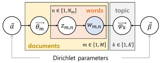 Research topics of each literature were determined by Latent Dirichlet Allocation (LDA), one of the most common tasks for extracting latent topics from text documents [31,32]. A graphical model of LDA is shown in Figure 1, where M denotes the number of documents, Nm is the number of words in a given document of which id is m, is the expected topic proportion of document m, generated by a Dirichlet distribution parameter . is the word distribution of topic k, which is generated by a Dirichlet parameter . and are the topic for nth word and the word in nth position in document m, respectively [33]. In this study, LDA was used as a form of implementation in the gensim package [34].