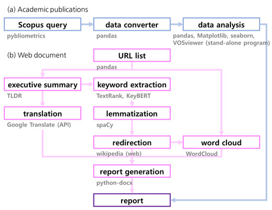 The analysis flowchart used in this study is shown in Figure 2, performed on Jupyter Lab, an integrated development environment for Python [47]. Contrary to academic literature data, web-posted articles are studied in detail. The paragraphs are summarized and translated to improve delivery, and the words are counted, transformed, and redirected to find reliable messages, and finally visualized as a word cloud to note the beginning of a chapter in a generated report. Most of the processes are automatic, except for data analysis and error handling processes, including redirection.