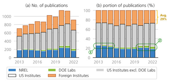 Academic publications of the NREL are classified by contributing affiliations and countries, and domestic (inside the United States) publications are subdivided into (1) stand-alone research performed by the NREL and the United States Department of Energy (DOE) and (2) collaborations between the laboratories governed or established by the DOE [48], (3) including other institutes outside of the DOE (for example, the Illinois Institute of Technology or University of Georgia) [49,50]. The number and proportion of publications during a given period are shown in Figure 3. The number of publications gradually increases, with the proportion in each category being practically constant. It should be noted that the articles for the year 2022 are still in progress. The only remarkable change as a function of time was the proportion of publications among DOE laboratories. The average for the first three years was 2.0% (region ①); however, for the last three years, this value doubled to 4.4% (region ②). Approximately 29% of the studies were conducted in collaboration with foreign institutions.