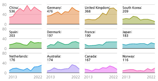 The number of collaborative publications in the top 12 countries is shown in Figure 5. Germany, Denmark, and Australia follow the NREL’s total publications trend shown in Figure 3a, where the United Kingdom is rapidly rising as a close partner. This is more clearly illustrated by a direct comparison of the number of co-authored publications between 2013 and 2022 (Figure 6). In most countries, the number of collaborative publications with other countries also increases as the total number of publications increases. There are a few countries with decreasing collaborations, namely South Korea.