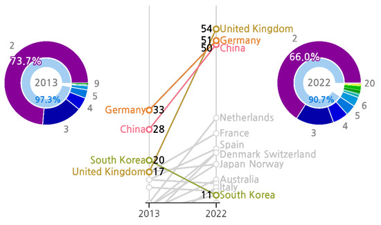Change in the number of co-authored publications by country between 2013 and 2022. Not all country names are displayed to avoid overlapping, particularly in 2022. Inset donut charts represent the proportions of publications by international collaboration. The number of co-authored countries is, attached next to the corresponding wedges; some annotations are omitted for better visualization of the maximum number.