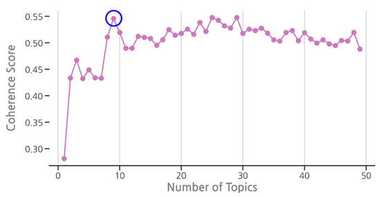 In order to figure out research trends by topic as well as the strengths of each institution, LDA was applied to the two institutions’ 12,548 abstracts of the last decade. By dropping the articles of which the abstract was absent, the number of articles published by the NREL and KIER slightly dropped to 8922 and 3626, respectively. The number of topics was determined as 9, which almost maximizes the coherence score (Cv) as 0.54, where the values above 0.5 are fairly good [52]. The maximum Cv, 0.55 was found at 29 topics (Figure 7), but we judged that the cost of analyzing 19 more categories exceeds the benefits.