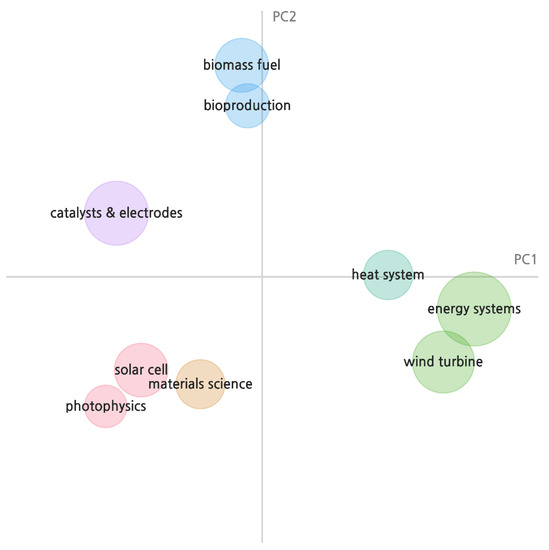 The topics were visualized on a principal component analysis (PCA) space Figure 8, which consisted of the first and second principal components (PC1 and PC2, respectively) with assistance from the python visualization package for LDA, pyLDAvis [80]. The size of the circles denotes the probability of documents. In the PCA space, it is expected that the topics located nearby are physically close. Nine categories might be regarded as four clusters as a function of the azimuthal locations on the PCA space. The right half (positive PC1) is almost of systems—heat system, energy system, and wind turbine. The topmost group is biomass—biomass fuel and bioproduction, whereas the bottommost one is photoelectric physics, materials, and application (solar cell). Another circle close to the electrochemical reaction (catalyst and electrode) is isolated.