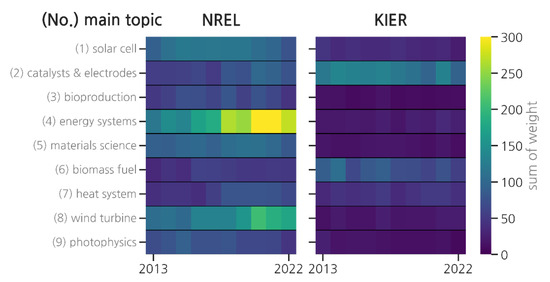 The smallest category is photophysics (6.49%), whereas the largest is energy systems (19.66%) of entire works of literature. If we can find differences between the NREL and the KIER in each category, it would be beneficial for the international collaboration strategy decision. In addition, if we can trace the number of publications as a function of time, it would also be helpful to figure out if a category has been popular in the past but decaying or emerging recently. Since works of literature are decomposed as a sum of keywords through LDA, the number of papers should be expressed as a sum of weights. Analysis of these viewpoints is visualized in Figure 9. Horizontal and vertical axes denote time and category, respectively. The sum of weights is represented as a colormap—the lighter, the more. Due to the fact that the total number of publications of the NREL is about 2.5 times larger than the KIER, the left panel (NREL) is lighter than the right one in general.