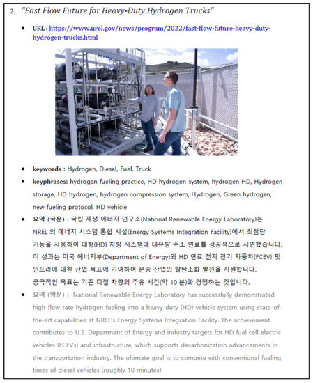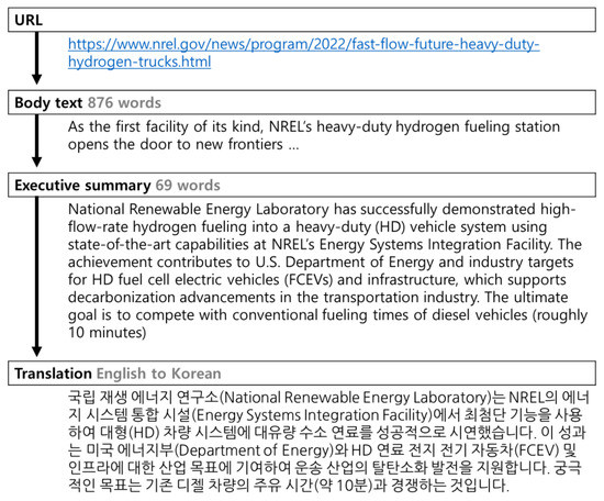 Contrary to the academic literature analyzed from a global view, web articles are processed individually for efficient filtering. The one who is in charge of international collaboration is supposed to read all web-posted articles because the articles are likely to be friendlier than academic papers for non-researchers; however, the problem is that the total amount could be too much for manual processing. Consequently, our strategy for web articles was summary and translation, as shown on the left branch of Figure 2b. An example of the process is represented in Figure 10. The article was about a heavy-duty hydrogen truck that consisted of 876 words [81]. TLDR summarizes it into 69 words in which the main message and important details, i.e., keywords and abbreviations, are kept and finally translated to Korean. The translation not only substituted English sentences with Korean but also maintained the most important words using parenthesis, for example, “국립 재생 에너지 연구소 (National Renewable Energy Laboratory)” and “연료 전지 전기 자동차 (FCEV)”.