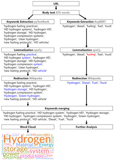 The other way, other than summarization and translation in Figure 2b, is for keyword extraction. The process with the same example is shown in Figure 11. The two keyword extraction algorithms, TextRank and KeyBERT, extract different keywords from an independent aspect. Both results are passed through lemmatization and redirection processes using spaCy and Wikipedia and finally merged. It is worthwhile to take a look before and after Wikipedia redirection. This process is for the treatment of synonyms utilizing the dictionary of Wikipedia; therefore, the keyword “clean hydrogen” is replaced with “green hydrogen”. The inputs and outputs of redirection are added to the dictionary to be saved in local storage to reduce redundant requests from the Wikipedia website [42]. Finally, the keywords are merged and placed beside the summary and translation, as well as converted to a word cloud for report decoration and insights delivery [46]. The abundant keywords extracted by pyTextRank can be cleaned up using a similarity measurement such as cosine similarity [82]; however, they can be used as raw materials for knowledge databases in the future. Nevertheless, with the possible usefulness, it is probable for readers to feel redundancy. In further studies on and using the described methodology, the number of similar words is going to be controlled by readers’ feedback.