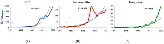 Evolution of scientific publications in AHP (blue line, chart (a)), investment risk (red line, chart (b)), and energy sector (green line, chart (c)) research.