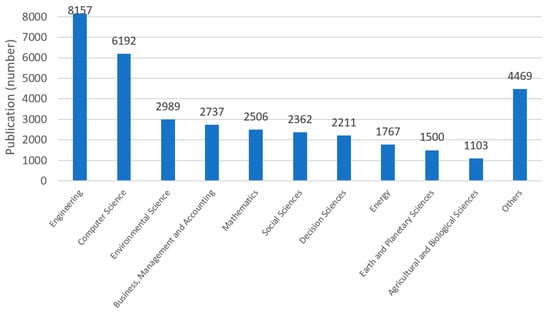 Studies that have applied AHP in the energy sector are essential to identify how many studies with the two searched topics are published, and Figure 2 shows this information. Most studies applied AHP in the engineering sector, with 8157 publications, while in energy there were 1767 works published.