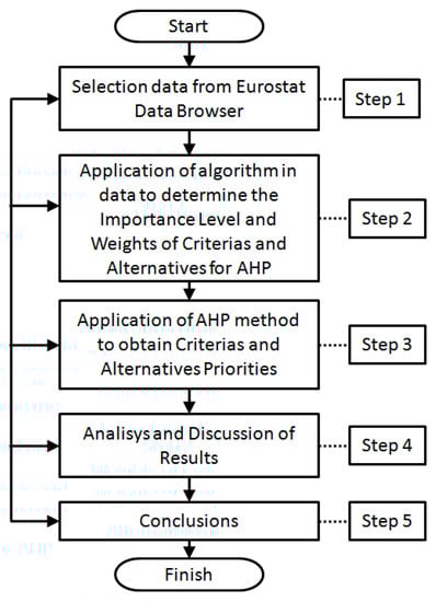 This research used a quantitative approach of multicriteria analysis through the analytic hierarchy process (AHP) methodology [,] in which the influence of indicator data on the energy sector of countries from the European Union was analyzed. Based on the obtained results, it is possible to determine the condition of the energy sector, the indicator of which will be each EU country’s energy security level. A ranking of countries can be used in investment projects in the productive sector since energy availability is a prerequisite for this activity, considering energy security. The data used for this research was extracted from the Eurostat Data Browser []. The research was developed according to a sequence of tasks described as a flowchart (Figure 3).