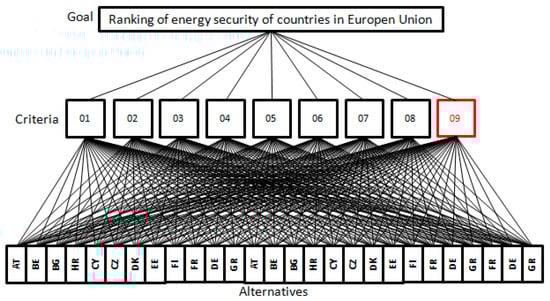 A tree representing the structure of the hierarchy of criteria and alternatives (Figure 4) to identify the ranking of European Union countries’ energy security is presented in Figure 4.
