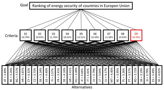 In Figure 5, the AHP hierarchy tree is shown with the results of the priorities of the criteria and alternatives obtained. Criterion 9, which represents the data on energy import dependency (%), is shown in red because it has an opposite effect on the priority of the criteria. That is, the higher the importance level, the lower the criterion’s weight must be. Noteworthy is that of criterion 5 (electricity production capacities for renewables and wastes in megawatts) was the most important from the whole set of criteria (IL = 13.5%). Another two, primary energy consumption (efficiency) and stock levels for gaseous and liquefied natural gas (million cubic meters), also obtained a higher importance level (IL over 11%) than the remaining criteria, of which their importance was on the level of 10%.