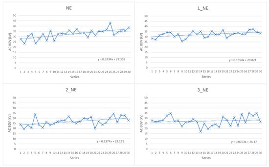 The graphical dependencies shown in Figure 1 represent how the BDV values developed across the individual measurements. The measured points of the curve of each nanofluid sample were fitted with a trending linear straight line for which the mathematical equation is included in the graphs. The trend line with the minimum value of the straight line indicates that the development of the BDV values had a stable character. Despite the low value of the angular coefficient of the fitting line (0.0703) of sample 3_NE, the measured values did not have a stable character, as confirmed by the statistical parameter of the standard deviation (4.64 kV). The jump voltage values periodically oscillated above or below the fitting line at the end of the measurement, which caused a low value of the angular coefficient.
