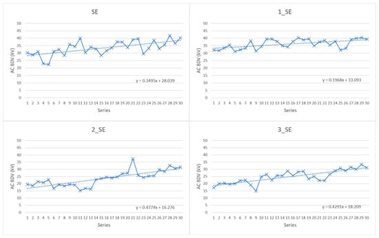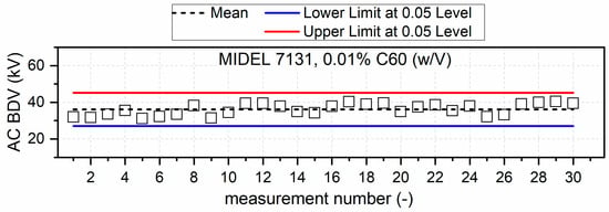 The straight line of the trend with the maximum value among the different concentrations of nanofluids indicated a growing trend, i.e., increasing values of the breakdown voltage with increasing number of applied tests. In our case, this was a sample of the synthetic ester MIDEL 7131 with a 0.02% w/v concentration of nanoparticles. For this sample, it was assumed that with an increasing number of breakdowns, the AC BDV values of the nanofluid would increase.