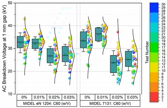 Besides the contradiction revealed in our experiments, the results obtained by measuring the AC BDV of samples of MIDEL eN 1204 nanofluids with nanoparticles in previously described concentrations had the opposite character to the measured values published in [13]. Beroual et al. concluded that concentrations of 0.1 g/L and 0.2 g/L decreased the mean value of AC BDV, but a concentration of 0.3 g/L enhanced it. Khelifa et al. [23] achieved an ideal scaling of the intermediate values of breakdown voltages for the synthetic ester MIDEL 7131, where C60 nanoparticles in any concentration contributed to the improvement of the AC BDV values of the nanofluids. The publication by Khelifa includes AC BDV results for different interelectrode distances—0.1 mm, 0.3 mm, 0.5 mm, 1 mm, 1.5 mm, and 2 mm—i.e., the values given in this publication can be directly compared with our measured values given in this paper.