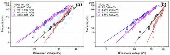 Figure 4 shows the Weibull distributions divided by the base fluid. Weibull function parameters such as shape and scale were calculated for each sample from the measured values (Table 4). The shape represents the value that describes the slope of the line that fit the Weibull probability plot. The scale value describes the mean failure probability value [18]. AC BDV values at low concentrations (0.01% w/v) of fullerene nanoparticles in both esters were visibly higher in comparison to pure oils at lower levels of probability (Figure 4).