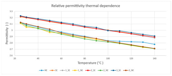 The relative permittivity of the examined insulating oils, as shown in Figure 6, suggested two groups around NE and SE. Values of relative permittivity in NE were lower in comparison to SE at all examined temperatures, and the differences moved from 3% to 6%.
