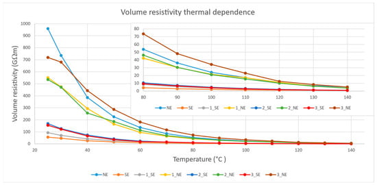 The volume resistivity (or DC resistivity) of a material represents how strongly the examined material opposes the flow of electric current through the volume of a cubic specimen, and it is reciprocal of the electrical conductivity [19]. Graphical representations of the obtained results are shown in Figure 7.