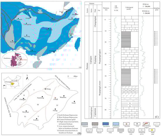 Paleogeographic map (A), geographic location (B), and stratigraphic column (C) of the Kaijiang-Liangping Trough: (A) paleogeographic map of Kaijiang-Liangping Trough [1]; (B) geographical location map of Kaijiang-Liangping Trough; (C) stratigraphic column of Kaijiang-Liangping Trough.