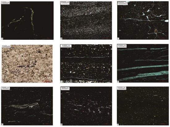 The siliceous clay shale in the lower part of the Wujiaping Formation (4346~4369 m) is composed of argillaceous, organic matter (Figure 2A), and quartz debris (Figure 2B). The bright and dark laminae are distributed alternately, with more debris particles in the bright layer and higher organic matter content in the dark layer, and the layer cracks are visible (Figure 2C). Plant debris can be seen (Figure 2D). Horizontal laminae development and fine sandstone mixed with silty mudstone can be seen (Figure 2E). The upper part (4328~4346 m) is a siliceous–calcareous mixed shale with massive horizontal laminae (Figure 2F) and layer alignment of large double-shell debris (Figure 2G), radiolarians, and bone spicule (Figure 2H), as well as a significant amount of bioclasts and organic matters filling the fissures (Figure 2I).