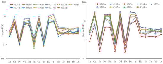 Total rare earth elements’ concentration ranges from 68.21 ug/g to 609.06 ug/g with an average value of 86.81 ug/g (Table 2), which is substantially greater than that of chondrite (65.9 ug/g) [32] and lower than the upper crust (146.4 ug/g) [25] and North American shale (NASC) (173.21 ug/g) [33]. The Wujiaping Formation’s shales contain comparable patterns of rare earth elements, according to this study’s normalization of rare earth elements by upper continental crust (UCC) concentrations (Figure 3) [25], presumably with terrigenous clastic rocks’ input.