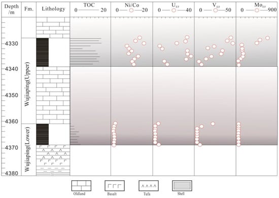Ni/Co is one elemental ratio that may be used to track redox conditions. Joness and Manning [40] suggested that a Ni/Co ratio over 7.00 represents an anaerobic environment, between 5.00 and 7.00 represents an oxygen-lean environment, and below 5.00 represents an oxygen-rich environment. Ni/Co ratios are all less than 5.0 in the lower part of the Wujiaping Formation, indicating an oxygen-rich environment. They are all higher than 5.0 in the upper part of the Wujiaping Formation, indicating a relatively anoxic environment (Figure 4).