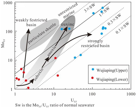 However, according to the research on biomarker compounds, the organic matter of the Late Permian Wujiaping Formation hydrocarbon source rocks in the eastern Sichuan region originated in a sulfur-rich and highly reducing environment [38]. The MoEF-UEF covariant mode of the research samples can clarify other factors such as the oxidation–reduction quality and limitation degree of the bottom water [39]. Most data from the Upper Permian Wujiaping Formation demonstrate that MoEF and UEF have almost similar trends at low values and a strong correlation, but as they go towards the upper domains, MoEF grows more in proportion to UEF, demonstrating a weak correlation (Figure 5). This trend suggests that MoEF/UEF are generally less than 1 in the lower part, and the period is basically in an open, weakly oxidizing seawater environment, which in the upper part of the Wujiaping Formation, marine waters change from suboxic to persistent hypoxic conditions, even to a strongly restricted environment. In terms of the depositional principles of Mo and V, the strong enrichment of MoEF and VEF indicates that the upper part of Wujiaping Formation is in a dead water environment, which reduces sulfidation. This confirms that, regionally, the Late Permian in South China had a variety of sulfidation environments from deep to shallow seas [1].