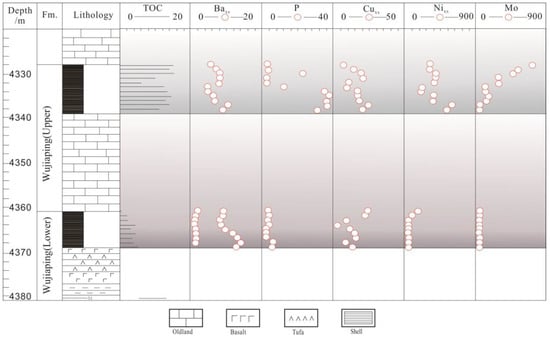 Ni and Cu are produced during the decomposition of organic matter and are maintained by pyrite capture in the sediment under sulfate reducing conditions, which means Ni and Cu are ideal indicators of the amount of organic matter entering the sediment under reducing conditions [43]. The upper part of the Wujiaping Formation has an average Ni value reaching 222.51 ug/g and an average Cu content of 140.64 ug/g. The terrestrial components of Cu and Ni need to be removed in order to reconstruct paleoproductivity. The Nixs in the upper part of Wujiaping Formation simples are on average 200.80 ug/g, almost twice as high as PAAS’s Ni concentration of 68 ug/g, and the Cuxs are on average 126.28 ug/g, almost three-times as high as PASS’s Cu concentration of 45 ug/g (Figure 6), suggesting a high level of paleoproductivity of the upper part of the Wujiaping Formation.