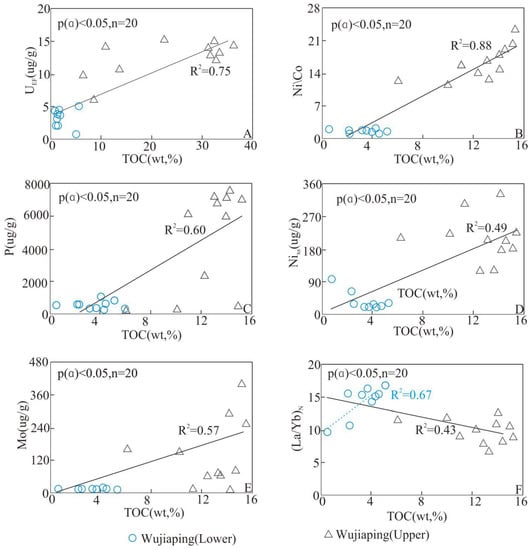 In order to determine the main controlling factor of the organic matter enrichment of the shale in the Wujiaping Formation, the relations between various indicators and TOC were analyzed, respectively. Figure 7A,B indicate that a significant positive correlation exists between the content of TOC and two redox indicators, UEF and Ni/Co, with correlation coefficients of 0.75 and 0.88, respectively (Figure 7). Simultaneously, the content of TOC is positively correlated with P, Mo, and Nixs, with correlation coefficients of 0.60, 0.49, and 0.57, respectively (Figure 7C–E). Therefore, the redox property and paleoproductivity have a significant impact on the content of TOC. The correlation between TOC and the deposition rate (La/Yb)N also reaches 0.44, especially with the lower part of the Wujiaping Formation, reaching 0.67 (Figure 7F).