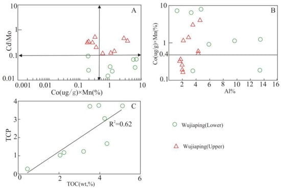 (A) Scatterplot of the Co × Mn and Cd/Mo of the shale of the Wujiaping Formation; (B) scatterplot of Co × Mn and A1%; (C) scatterplot of the TCP and TOC of the lower part of the Wujiaping Formation.