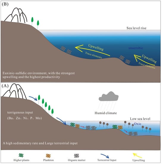 In the global plate tectonic framework, the Permian on the Sichuan Basin is located in the eastern structural domain of the Tethys Ocean in the Permian, surrounding the eastern Tethys Ocean and the Paleo-Pacific Ocean [57]. The eastern Circum-Tethys Ocean is located in the upwelling region [48], and the hydrothermal upwelling developed in the upper part of the Wujiaping Formation in the late Permian, so that a large amount of nutrients may reach the sea surface with the upwelling, stimulating the development of primary productivity. When the upper part of the Wujiaping Formation was deposited, the sea level was always higher with the continuous rise of the sea level. The deep-water setting promoted the formation of the sulfidation reducing environment, which was conducive to the preservation of organic matter. Coincidentally, during this period, biological extinction occurred, accompanied by a wide range of lentic environments, resulting in the release of H2S gas, and the scope of sulfurization was large [58]. Therefore, sea level rise, the sulfidation reducing environment, and upwelling affect productivity and preservation conditions and promote the enrichment of OM (Figure 9B).