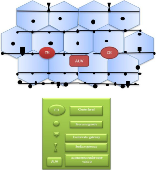 The Surface Gateways (SG) and Cluster head make up the underwater network (CH). SGs are static nodes fastened to surface-based buoys. They have electromagnetic and acoustic interfaces, respectively. Through an electromagnetic interface, SGs link the underwater network to the Internet. SG uses an acoustic interface to transmit and receive packets to the underwater network. One or more CHs may be connected to each SG. To relay packets from SGs to the active AUVs at the ocean floor and vice versa, CHs are positioned underwater at various depths is shown in Figure 2.